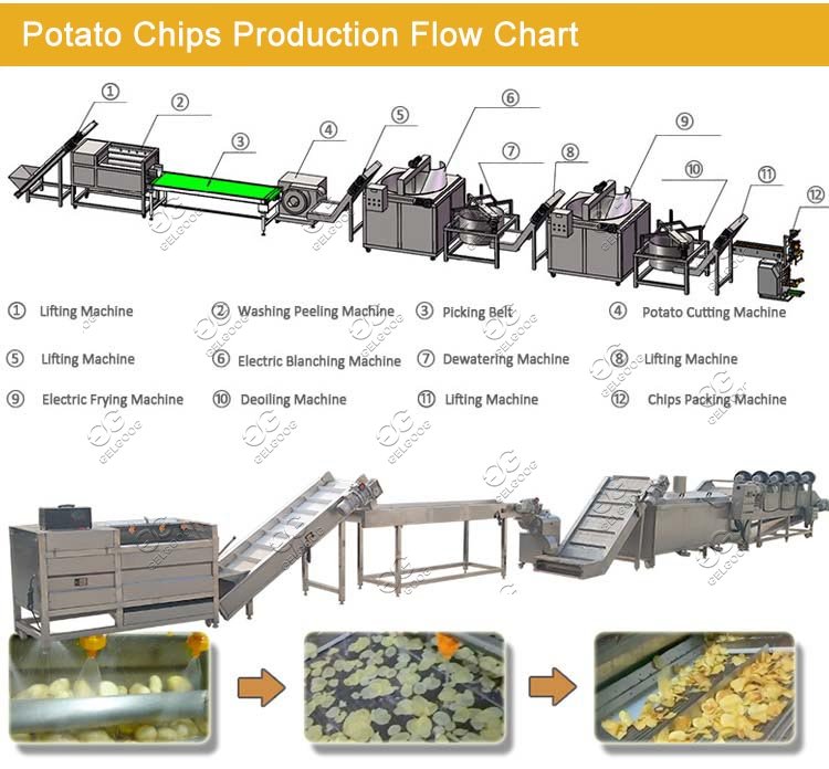 Potato washing peeling -- Lifting -- Selecting the bad ones -- Slicing potato into potato slices -- Lifting -- Blanching for protecting color -- Dewatering -- Lifting -- Frying -- Surface oil removing -- Lifting -- Seasoning -- Packing.